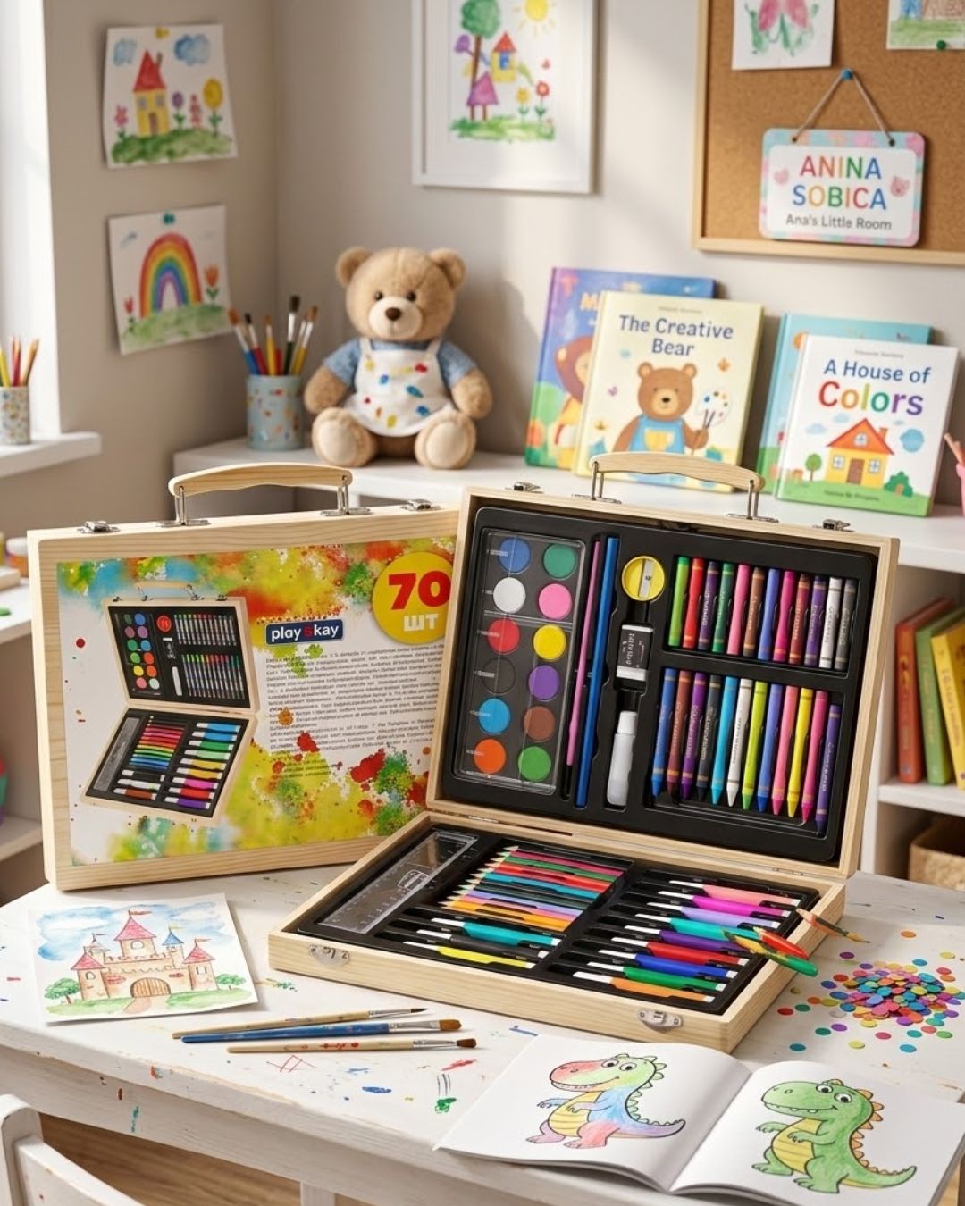 Zamislite trenutak kada dete otvori ovaj drveni kofer i pred njim se pojavi čitav svet boja… oči zasijaju, mašta počinje da radi, a običan papir postaje pravo malo umetničko platno. Upravo to donosi ovaj komplet za crtanje od čak 70 delova – savršen početak svake male kreativne avanture. ✨