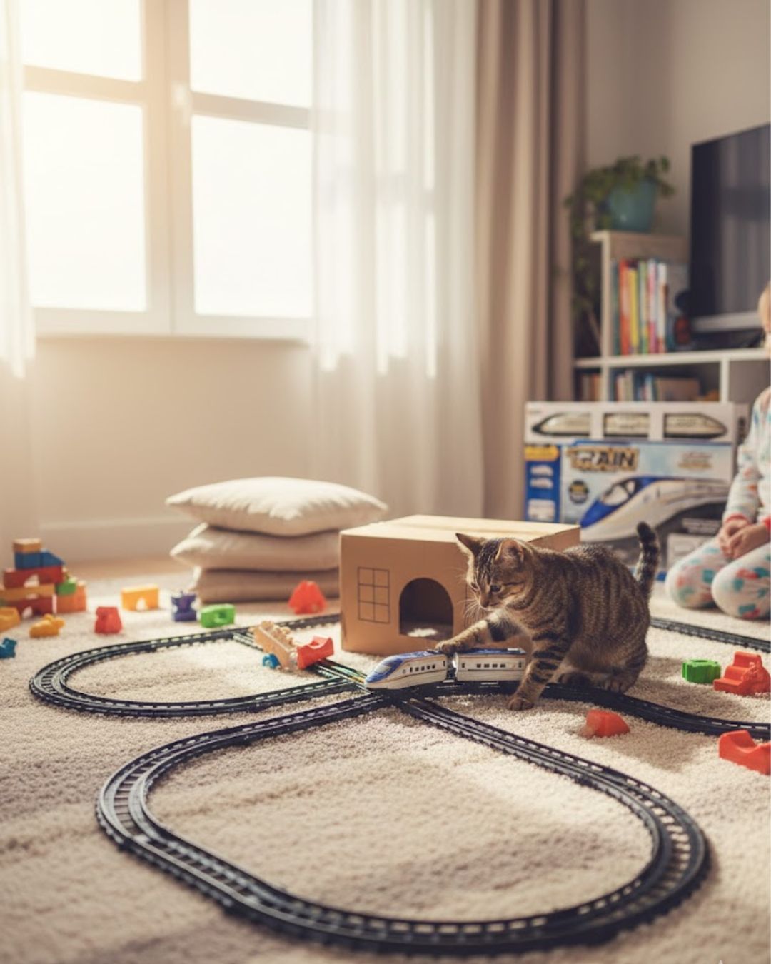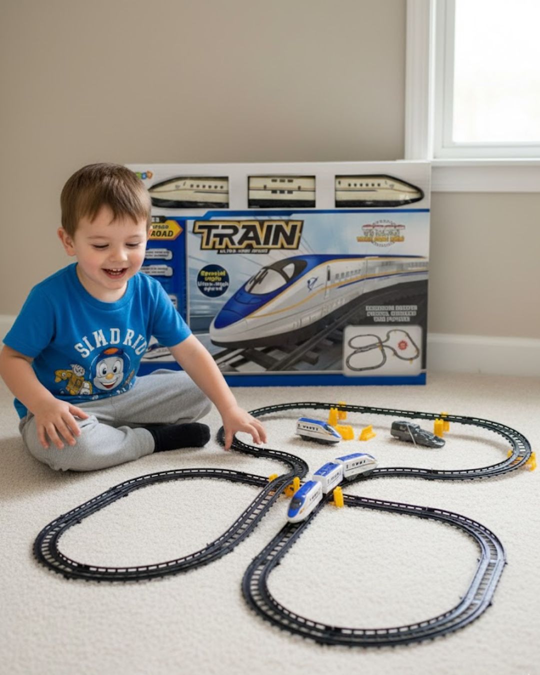 Sa svakim krugom, voz juri kao pravi brzi voz, prelazi mostove i ulazi u zavoje — a dečja mašta putuje do dalekih gradova i neverovatnih avantura!